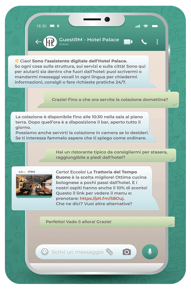 GuestRM è un sistema di intelligenza artificiale che risponde automaticamente alle domande degli ospiti su WhatsApp. Conosce ogni dettaglio della tua struttura e assiste gli ospiti 24 ore su 24, come farebbe un concierge umano.
